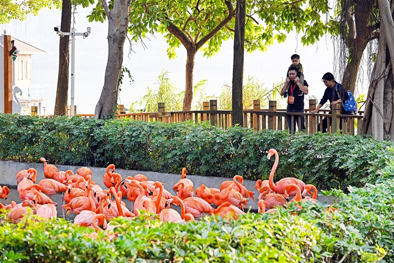 12月2日,在肇庆星湖湿地公园,游客观赏火烈鸟。