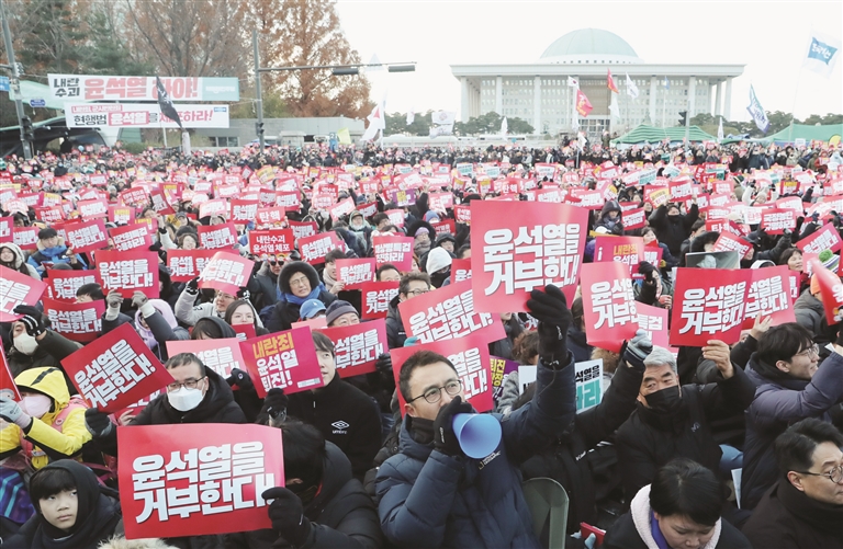 12月7日,在位于韩国首尔的国会附近,韩国民众集会要求弹劾总统尹锡悦 新华社记者 姚琪琳 摄