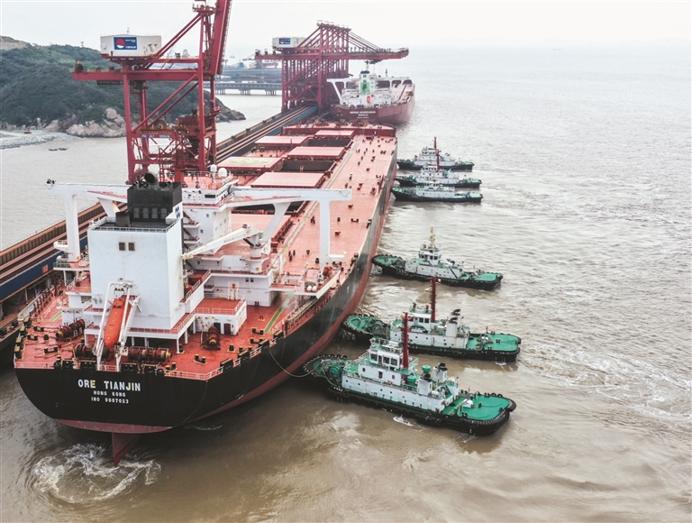 《方案》中提到,在铁矿石领域,延伸发展铁矿石中下游加工产业,建设辐射亚太地区的国际混配矿分销中心。这让舟山鼠浪湖码头有限公司董事长任国庆眼前一亮:“这是挖掘发展前景的一汪‘蓝海’。”鼠浪湖矿石中转码头是我国最大的海上铁矿石中转基地,也是目前国内最大的单体保税混配矿码头,混配矿产量连续五年位居国内第一,前些日子更是实现全球首次双40万吨级世界最大矿船同靠接卸。