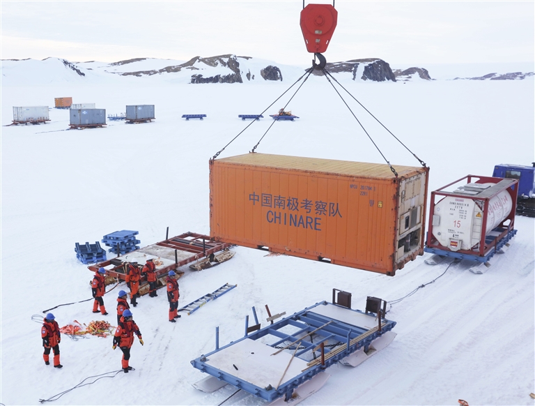 中山站位于南极普里兹湾的拉斯曼丘陵。从科考船向中山站运送物资,需要一路破冰并尽可能接近中山站,再通过雪地车或直升机卸货。