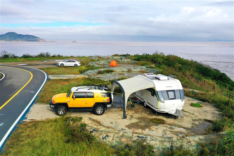 近日,在岱山县最美公路的海边露营地,一辆在此过夜的拖斗式房车迎来晨曦。近年来,驾房车、搭帐篷等方式逐渐成为舟山旅游新热点。摄影 记者 沈磊
