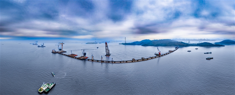 双屿门大桥和青龙门大桥两座世界级大桥齐头并进,横跨六横、佛渡、梅山3座独立岛屿,如同一条跨越山海的纽带,将舟山南翼岛群与周边大陆紧紧连接。建设过程中,复杂的地质水文条件对作业有着极大的影响,大桥建设者们不断探索新技术、新方法,为推动项目建设跑出了“加速度”。