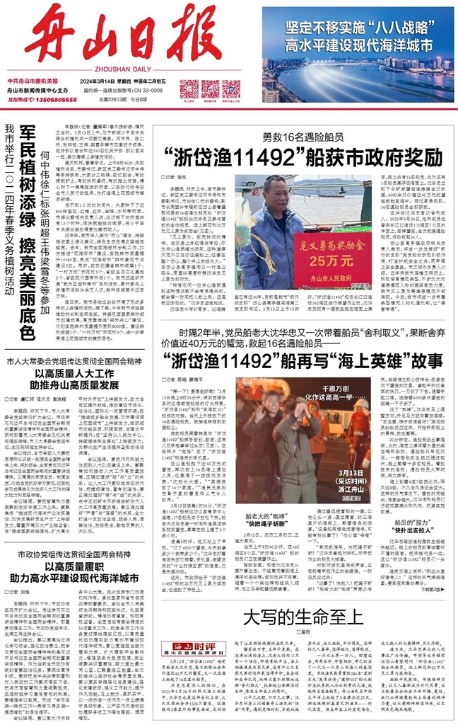 2024年3月12日,“浙岱渔11492”船长沈华忠在长江口渔场162海区作业时,果断舍弃价值36万元的蟹笼,带领船员们全速驶向3海里外的事发海域,成功救起16名落水船员。