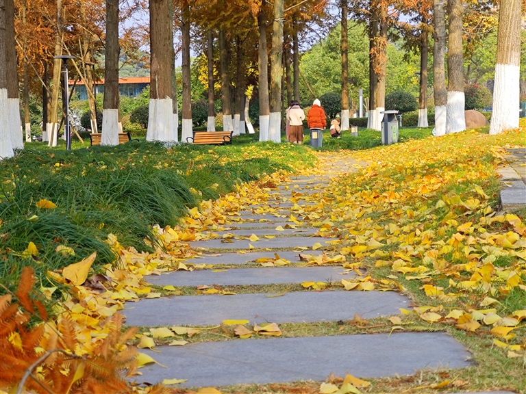 12月15日下午,记者来到试点区域之一的武岭湿地公园走访。只见金黄的银杏叶落在草坪上、石径上、滑梯上,整个公园已呈一片金色的海洋,前来赏景打卡的市民络绎不绝。“只有这个季节才能看到这满地金黄,有关部门不扫落叶的措施给老百姓留足观赏时间,我觉得值得点赞。”市民陈先生说。