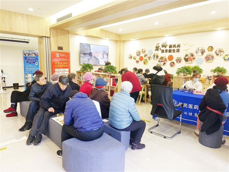 在该街区的乐龄中心,老人们三五成群聚在一起,或下象棋,或拉家常,或享受护眼体验,其乐融融(见图)。这里不仅为老年人提供休闲娱乐场所,还推出每周一次的义诊、理发、观影、讲座等公益活动。“这是专为我们老年人打造的街区,店铺的招商选择很贴心,还根据老年人不同的兴趣爱好,给我们安排了丰富多彩的娱乐活动。”86岁居民徐采荣夸赞道。