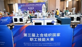 当日,第三届上合组织国家职工技能大赛在青岛市开幕,参赛技术工人代表在工业机器人操作调整工、智能制造工业控制、装配钳工3个项目中同场竞技。本次比赛旨在通过赛训结合、专题讲座、技能交流、企业参观等形式,促进上合组织国家职工技能交流、互学互鉴、增进友谊。 新华社记者 李紫恒 摄
