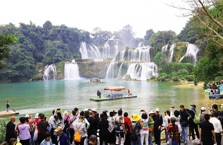 12月5日,游客在中越德天(板约)瀑布跨境旅游合作区中国一侧游览。