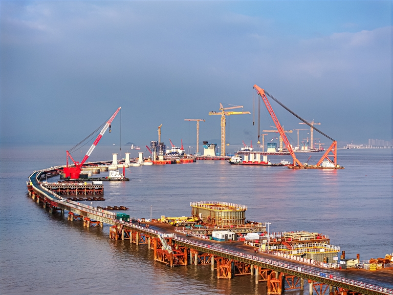 六横公路大桥二期青龙门特大桥已全面进入水面以上施工,似长龙遨游东海,蔚为壮观 资料图