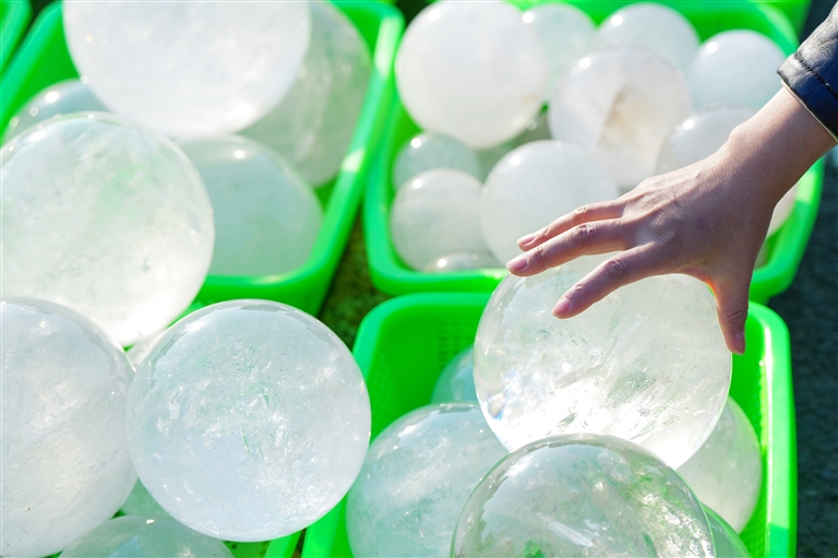 近年来,江苏省连云港市东海县依托独特的水晶资源,打造全国性水晶原料集散地和交易中心。当地每月定时在中国东海水晶城淘晶广场组织“水晶大集”,设置2000多个水晶产品摊位,销售各类水晶原石、水晶手串、水晶吊坠、水晶雕刻品等,吸引众多市民游客前来选购。据介绍,江苏省连云港市东海县拥有各类水晶加工企业3400多家,相关从业人员约30万人。