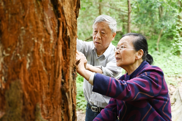 今年10月,记者跟随俞慈英来到定海茅岭墩,移植到这里的一批红杉树苗已长大成林。她拿出专用的工具测量一棵长得最高的红杉树,爽朗地报出一串数据:“长了,高了,胸围有2.25米,胸径71.5厘米,高约20米,冠幅10米!”