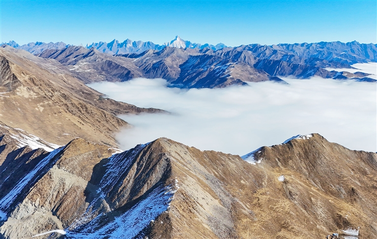冬日的四川夹金山,云海翻腾。从高空俯瞰,连绵起伏的群山被云海笼罩,呈现出壮美的自然风光。