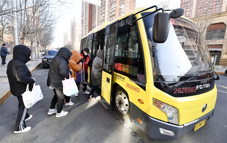 12月25日,朝阳区高碑店乡花园闸社区的居民乘坐便民小型公交车出行。北京市朝阳区高碑店乡花园闸社区北花园小区附近过去没有公交、地铁等交通站点,居民出行极为不便。近日,高碑店乡与交管部门、公交部门沟通协商后,开通了被居民称为“温暖小公交”的公交出行线路,配备了连通附近公交站点和地铁站点的便民小型公交车,解决了居民出行“最后一公里”难题。 新华社记者 李欣 摄