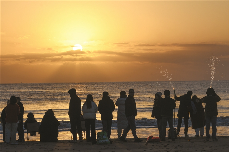 ▲昨天早晨,朱家尖东沙景区,游客们在海边迎来新年第一缕阳光 图/姚凯乐