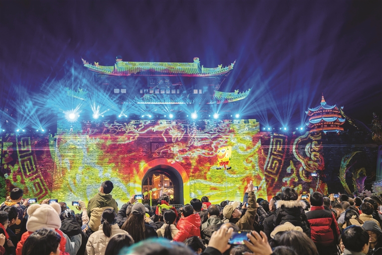 ▶昨天晚上,定海古城光影秀,为新年增添喜庆气氛 图/余若望