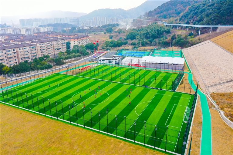 昨天,东海云廊8号入口,无人机镜头下,总面积达34000余平方米的定海运动公园色彩靓丽。该公园拥有多个人工草坪足球场、1个天然草坪11人制足球场,还新建网球场、篮球场和乒乓球场地,进一步满足市民多样化的健身需求。 摄影 记者 张磊