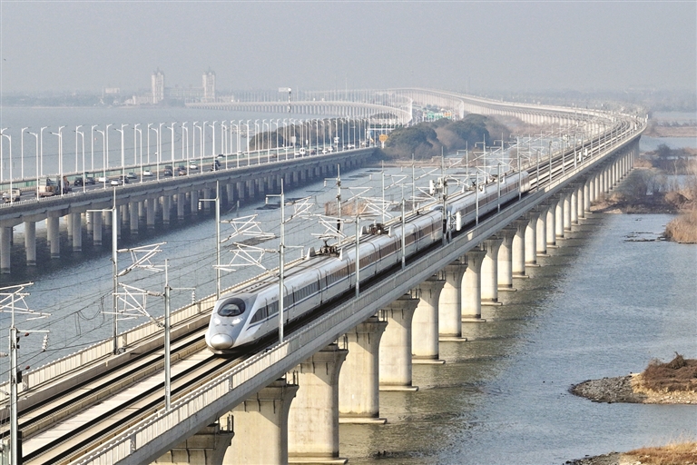 1月4日,一列动车组列车驶过沪宁沿江高铁江苏常州滆湖特大桥段(无人机照片)。