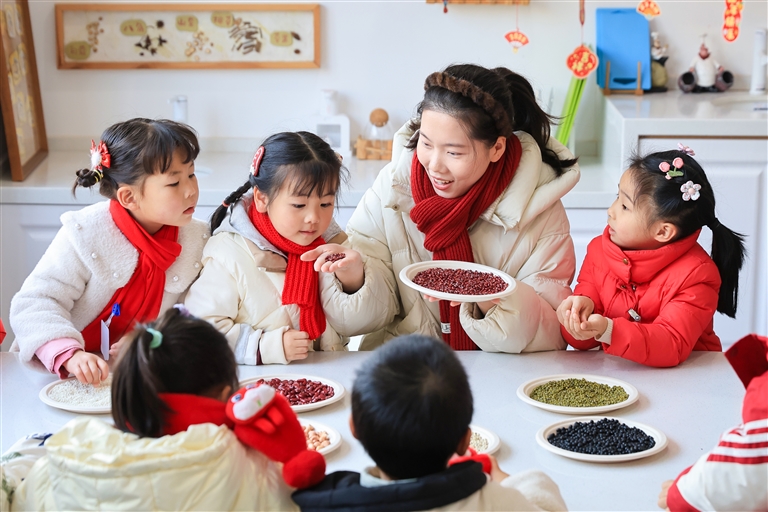 1月6日,在江苏省南京市安德门幼儿园,老师教小朋友辨识制作腊八粥所需的食材。腊八节将至,各地纷纷展开多种多样的活动迎接腊八节。 新华社 发(苏阳 摄)