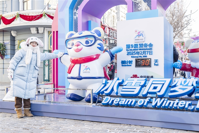 1月8日,在哈尔滨中央大街,游客在亚冬会倒计时景观前拍照留念。