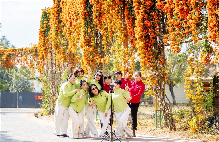 1月7日,在德宏傣族景颇族自治州陇川县陇把镇龙安村,盛开的炮仗藤花吸引游客拍照打卡。