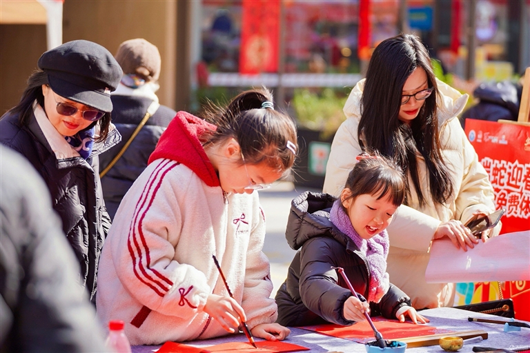 不远处的游戏区传来欢声笑语。为打造过年仪式感,迎新“妙”会还融合了年俗游园会,市民可以体验打年糕、写福字、投掷铜币等传统年俗。