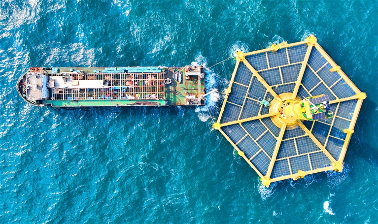近日,在黄海深处离岸约130海里的青岛国家深远海绿色养殖试验区,中国自主研制的大型深海智能渔业养殖装备“深蓝2号”迎来首次三文鱼收鱼作业。据介绍,该网箱共养殖三文鱼近40万尾,存活率高,长势良好。 新华社记者 李紫恒 摄