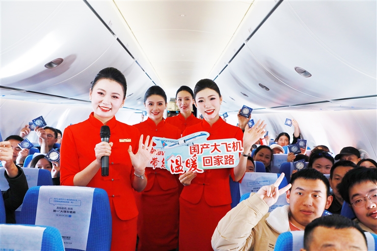 1月14日,在南航CZ8233广州—成都天府航班上,空乘人员开展C919国产大飞机投入春运主题活动。1月14日是2025年春运第一天,中国南方航空3架C919国产大飞机全部投入春运,执行广州往返杭州、上海虹桥、海口、成都天府4条航线的10个航班。 新华社记者 王瑞平 摄