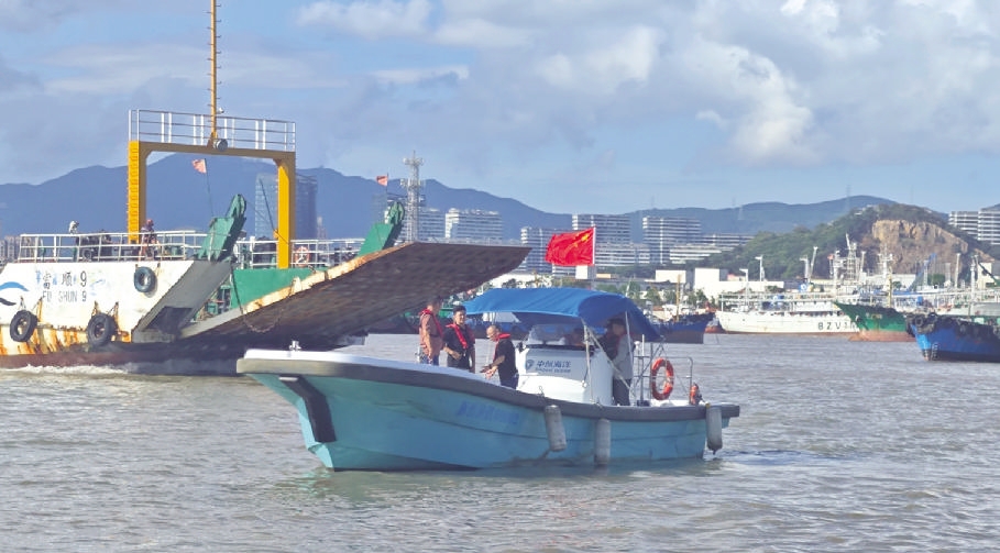 当天下午2时45分,记者在“中创量云”厂区码头见到了新的“浙普渔供60002”舢板。天蓝色船体搭配蓝色遮阳棚,甲板上救生衣、救生圈等安全设施摆放整齐。“中创量云”副总经理徐跃与船长翁连华正在做出航准备。此次试航从“中创量云”厂区码头出发,横渡沈家门渔港,前往中沙头码头。