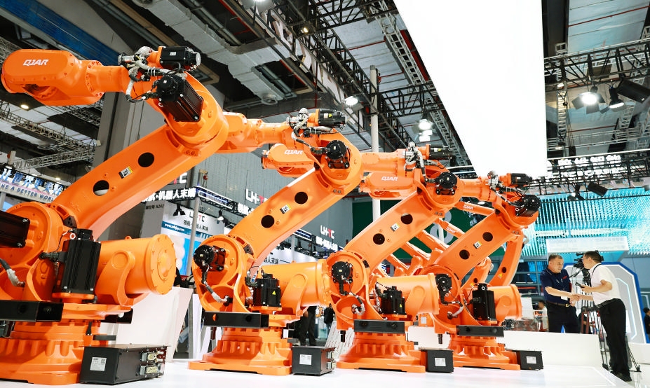 这是展览现场展示的一组大型工业机器人产品(9月23日摄)。