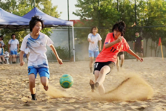昨天上午,舟山市第十一届中小学生阳光体育运动会沙滩足球比赛在浙江海洋大学沙滩足球场举行。此次足球比赛吸引了20多所中小学校的近50支沙滩足球队参赛,参赛球员超过500名,参赛人数与规模创历史新高。 摄影 通讯员 沈汝汝 见习记者 董凌浩