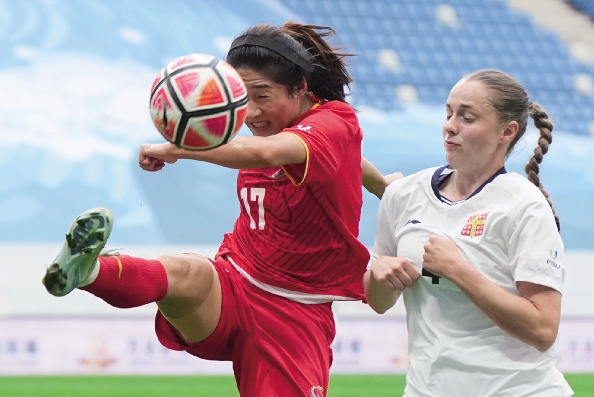 9月27日,上海体育大学女足球员李渟英格(左)在比赛中解围。