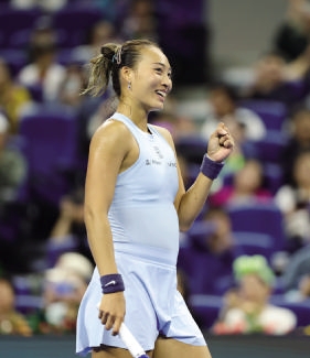 9月27日,郑钦文在比赛获胜后庆祝 新华社记者 白雪飞 摄