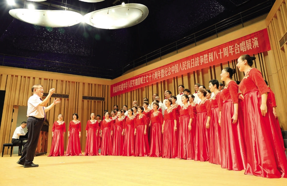 9月27日下午,由市文联主办,市音乐家协会承办的“舟山市庆祝中华人民共和国成立七十六周年暨纪念中国人民抗日战争胜利八十周年合唱展演”在舟山市海洋文化艺术中心二期音乐厅举行。全市13支优秀合唱团队的近300名演员深情演绎了《祖国不会忘记》《如愿》《十送红军》等多首经典与新作,展现了舟山群众文化的蓬勃生机,进一步激发了广大市民的爱国热情和民族自豪感。摄影 记者 陈永建 通讯员 应豪莹