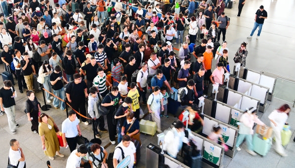 9月29日,旅客在江苏无锡站候车大厅排队检票。铁路国庆中秋假期运输9月29日启动,将于10月10日结束,为期12天。 新华社 发(还月亮 摄)