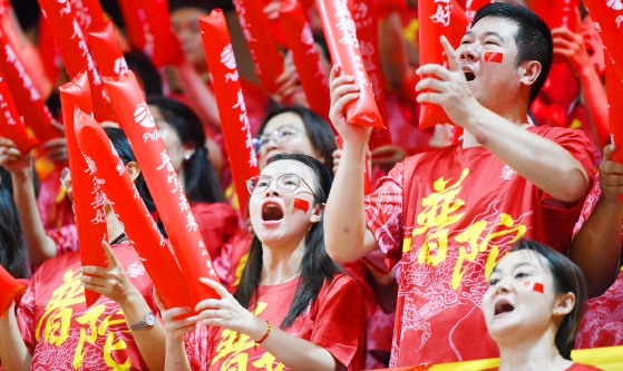 本场比赛恰逢国庆节,赛场内外一派“红红火火”(见图)。观众席座椅上为助威团准备了红黄二色的应援T恤,穿上后可通过排列组合出“中国”二字,为祖国庆生。不少球迷举着小红旗逛场外的文旅集市,共唱《歌唱祖国》。