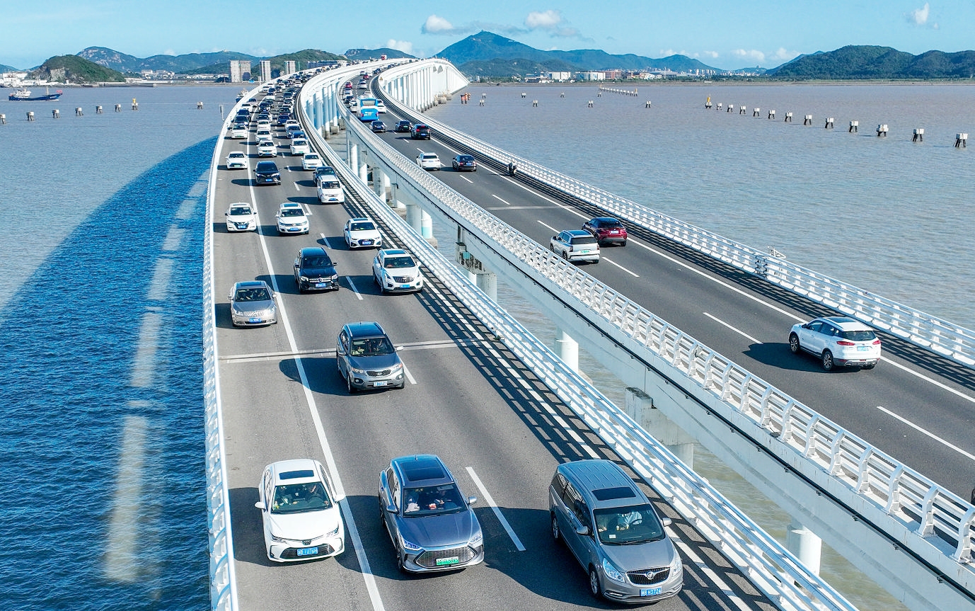 10月7日,在浙江省舟山市普陀区,返程车辆行驶在朱家尖海峡大桥上(无人机照片)。10月7日,国庆中秋假期进入尾声,各地返程客流攀升。 新华社 发(邹训永 摄)
