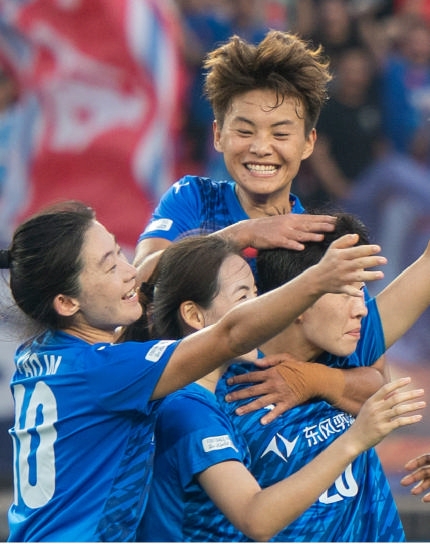 10月8日,武汉车谷江大队球员姜晨璟(左二)进球后与队友姚伟(左一)、王霜(上)、金慧利庆祝 新华社记者 杜子璇 摄