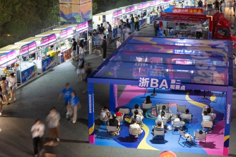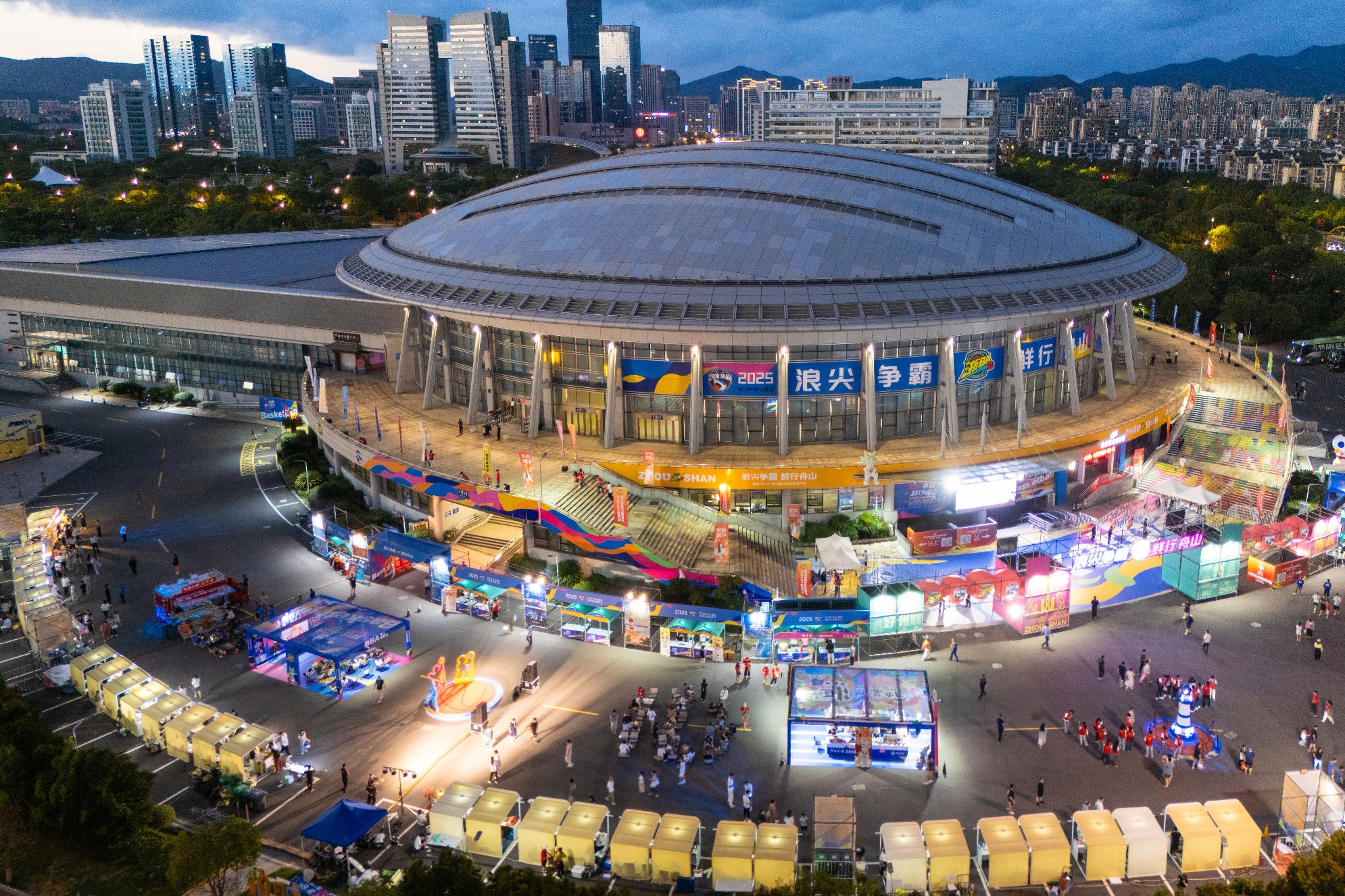 舟山体育馆外,2025“浙BA”舟山赛区文旅市集点亮岛城的夜晚