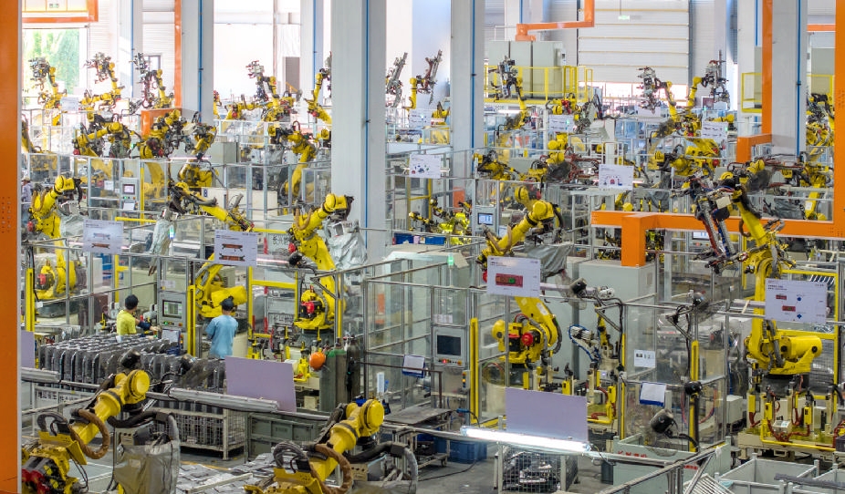 10月9日,浙江省湖州市长兴经济技术开发区的长兴地通汽车部件有限公司技术人员操控工业机器人生产新能源汽车配件(无人机照片)。