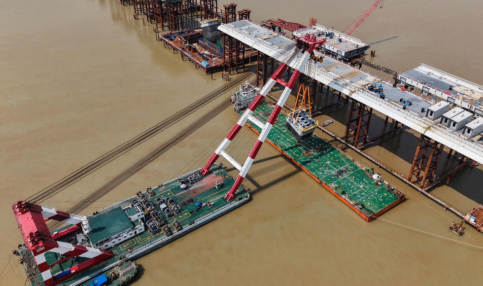 10月10日,由中铁建大桥局承建的万龙大桥吊装架设首节段主塔。位于广州南沙区的万龙大桥跨越珠江口龙穴南水道,全长5146米,主桥长1150米,主跨608米,为粤港澳大湾区又一世界级桥梁。