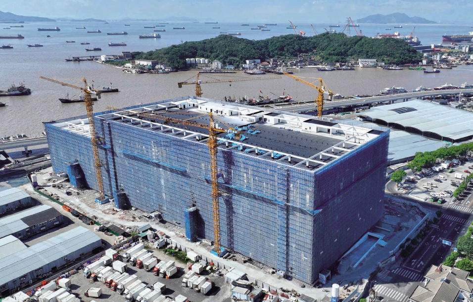 航拍器下的舟山国际水产城冷链物流园区一期建设项目规模庞大。10月11日,200余名工人正在工地现场,争分夺秒推进项目装饰装修及设备安装。