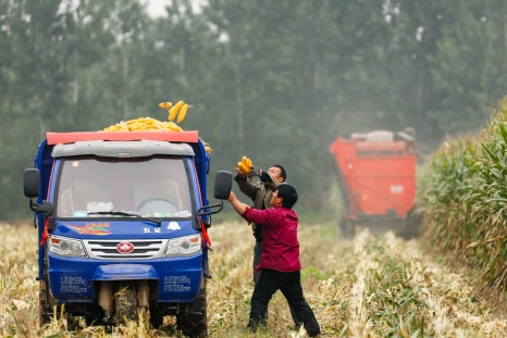 10月11日,在河南省武陟县嘉应观镇一处农田,农民驾驶农机抢收玉米。