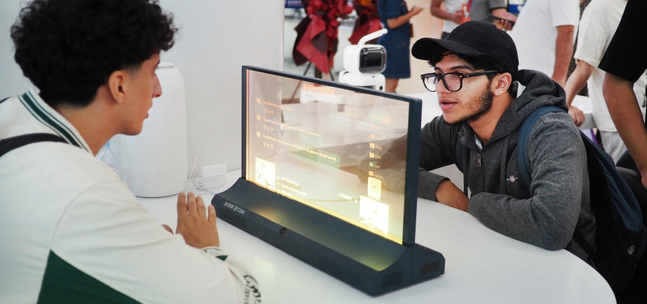 10月14日,两名外籍客商在义乌全球数贸中心体验AI翻译互动屏 新华社记者 刘梓漪 摄