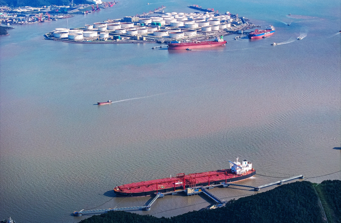 同一时间满载原油的30万吨级油轮“帝国”“新甬洋”分别靠泊舟山册子油库码头、舟山外钓岛光汇原油码头进行卸油作业。