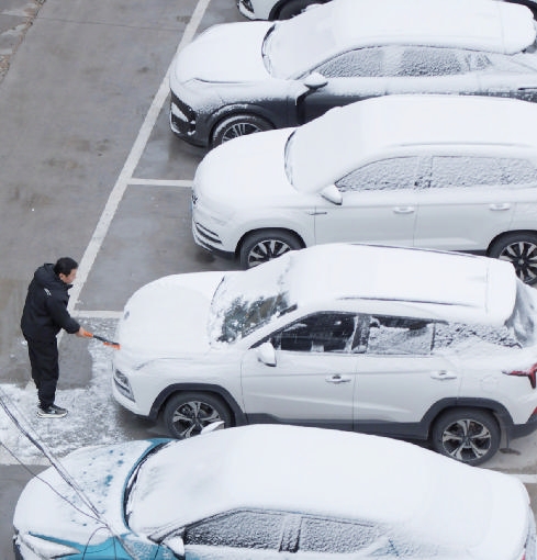 10月15日,在黑龙江省齐齐哈尔市一小区,市民在清理车辆上的积雪。当日,黑龙江省多地迎来降雪天气。