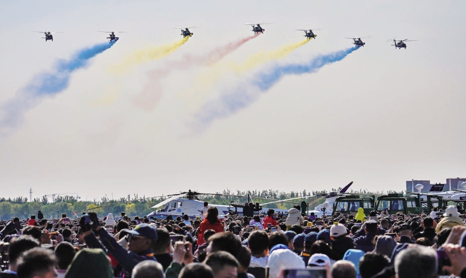 10月18日,在第七届中国天津国际直升机博览会上,参观者观看飞行表演。