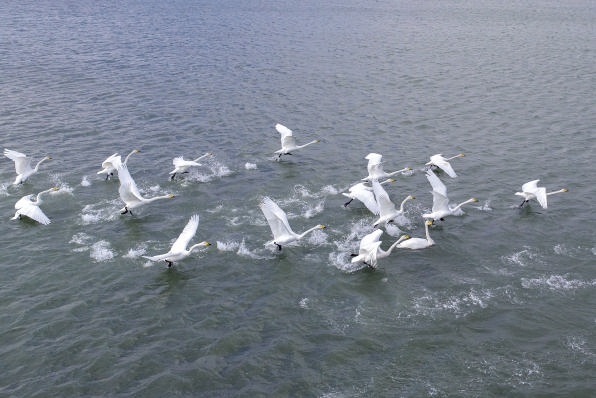 10月18日,首批越冬大天鹅在天鹅湖湖面飞翔(无人机照片)。