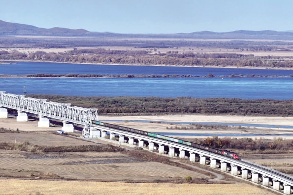 10月16日,满载进口物资的货物列车通过同江铁路大桥驶向中国铁路哈尔滨局集团有限公司同江北站(无人机照片)。
