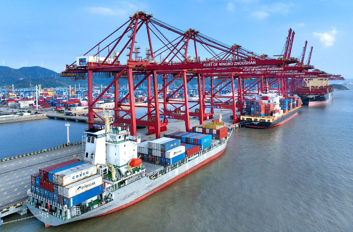 2025年10月13日,在宁波舟山港金塘港区大浦口集装箱码头,船舶进行集装箱装卸作业(无人机照片) 新华社 发(邹训永 摄)