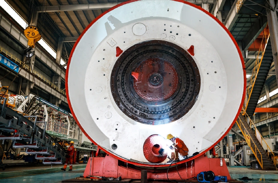 10月27日,中铁科工集团轨道交通装备有限公司技术工人对盾构机盾体进行电焊作业 新华社 发(赵军 摄)