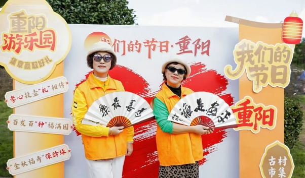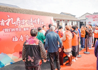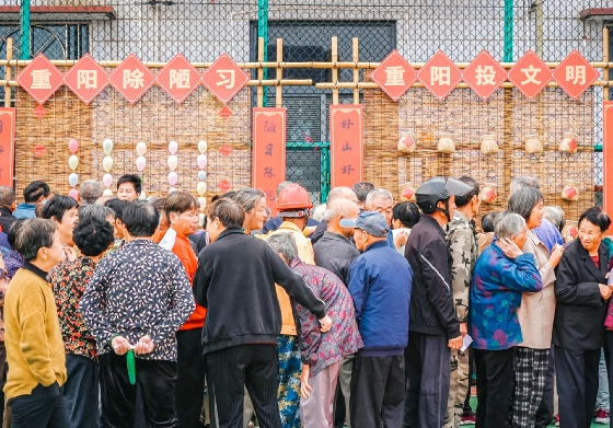 “乡风润万家 重阳暖人心”活动也正在普陀区东港街道南岙村热火朝天地进行中。韵味古村市集上,非遗窗花、特色美食、农产品展销和书香赠书活动吸引村民驻足流连。互动打卡区里,孝心投壶、“种福”满园等游戏将文明乡风理念寓教于乐。夜幕降临,“金秋礼堂·重阳晚会”将活动推向高潮,90岁以上老人代表在掌声中共切“情暖重阳”蛋糕,接受全场祝福。